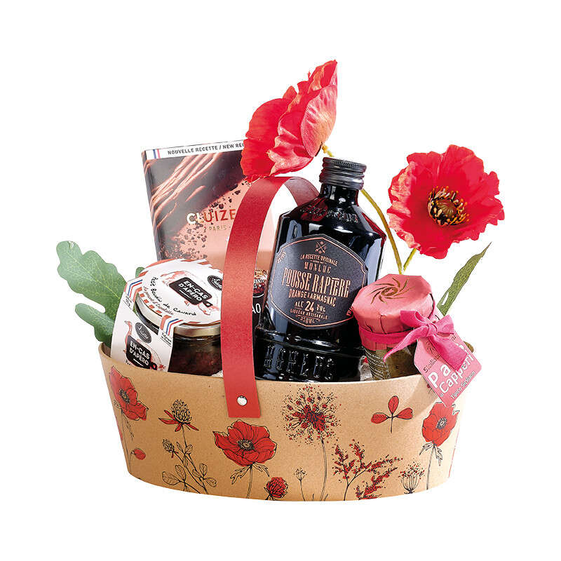 Elegant basket with a red floral pattern and a handle, ideal for creating refined gift baskets.